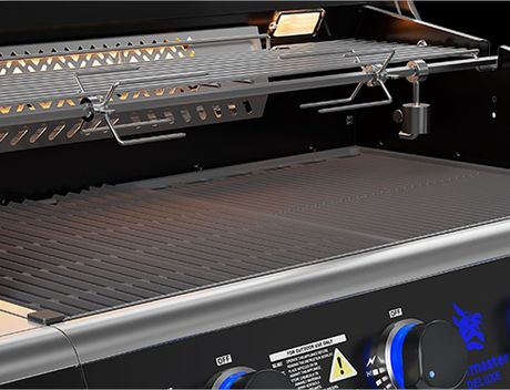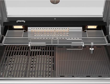Heavy-duty reversible cast iron grills that spin 180 degrees and drop close to the flame for rapid searing or lift for gentle cooking.